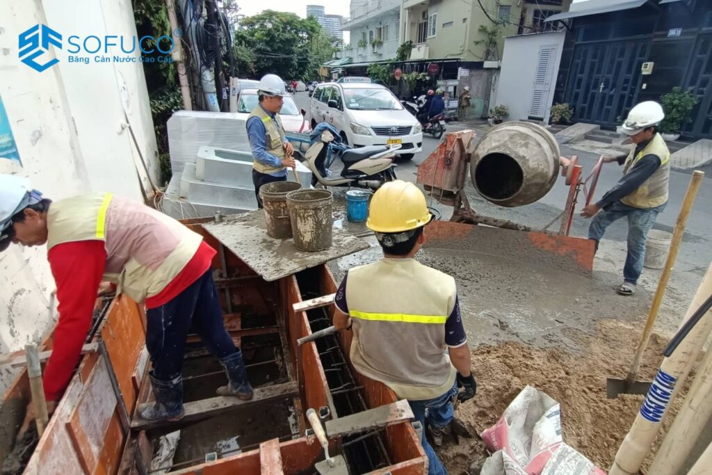 Bước 4 – Kiểm soát đổ bê tông và đầm dùi: Đổ bê tông đều hai bên dải băng để tránh áp lực làm đổ ngã. Đầm dùi kỹ quanh khu vực băng cản nước để loại bỏ rỗ tổ ong – nguyên nhân chính gây thấm sau này.