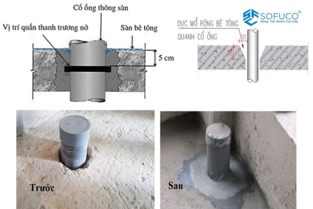Với cổ ống xuyên sàn, điều quan trọng là xác định đây đang là chi tiết cần trám kín, tạo hình và phủ chống thấm, hay đang là bài toán cần tính cùng hệ chống thấm kết cấu của toàn hạng mục.
