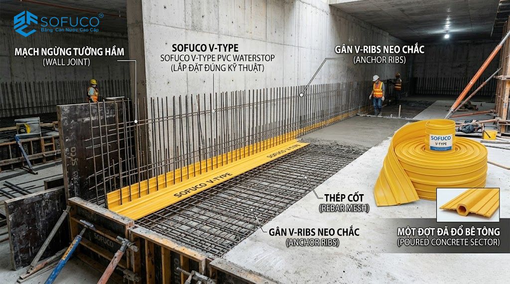 SOFUCO khuyến nghị: Với các công trình hầm sâu có áp lực nước ngầm lớn, việc kết hợp cả Băng cản nước PVC Model V ở giữa và thanh trương nở ở mép ngoài là giải pháp “phòng thủ hai lớp” an toàn nhất hiện nay.